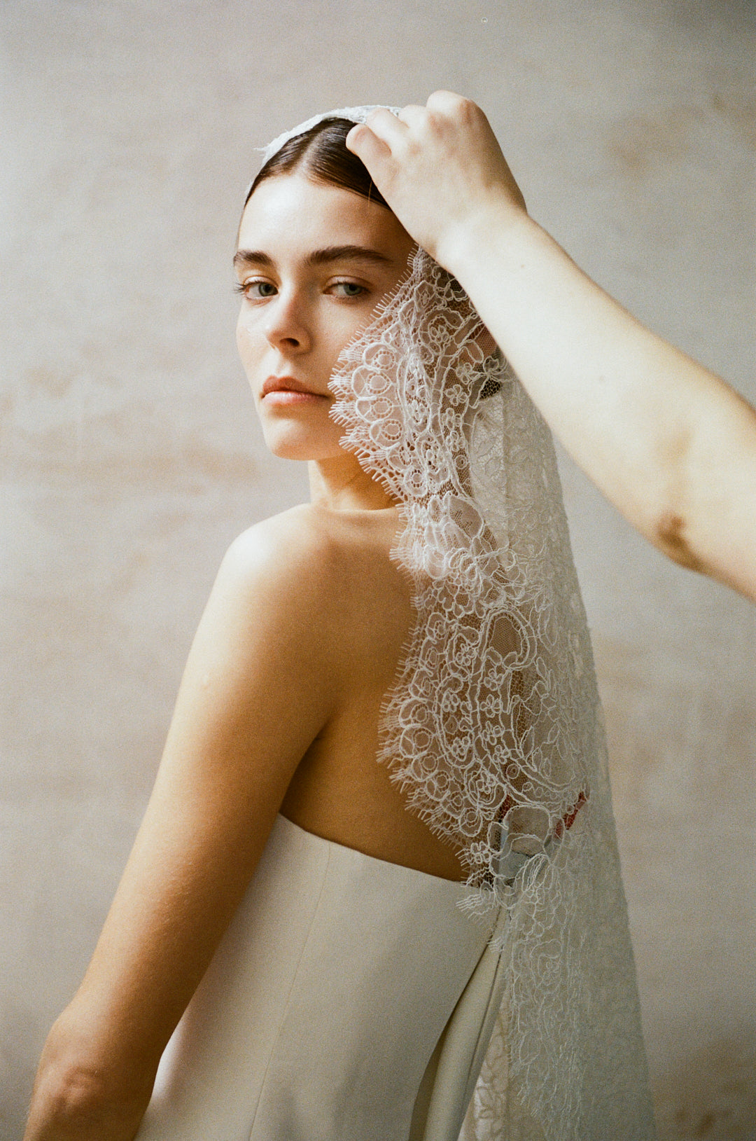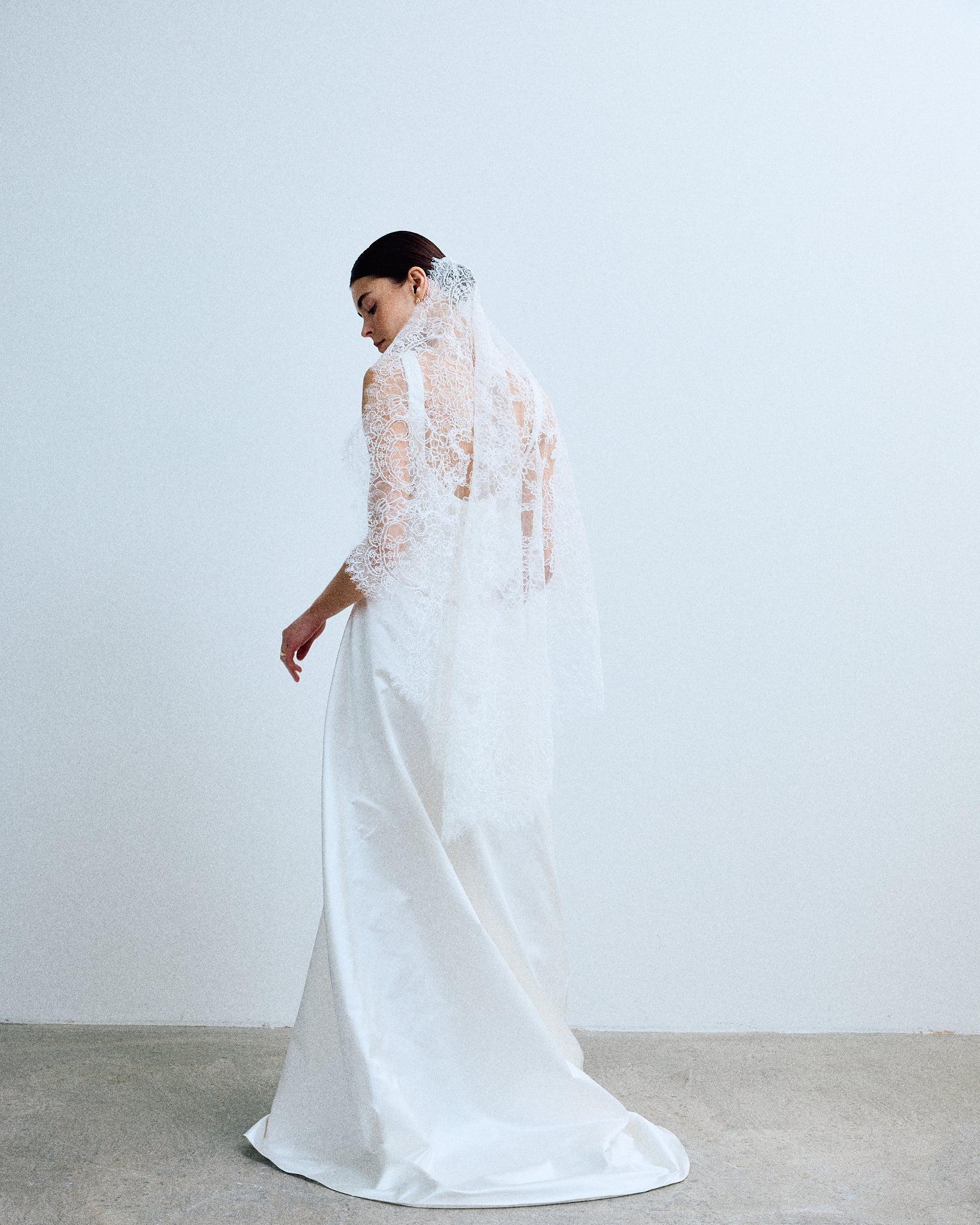 inspired by a traditional mantilla veil, nora offers a delicate lace head covering to add texture and tradition to any contemporary clover gown.