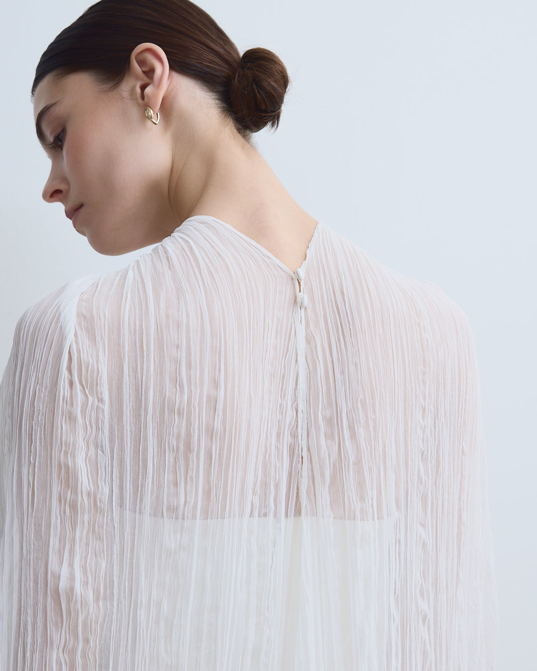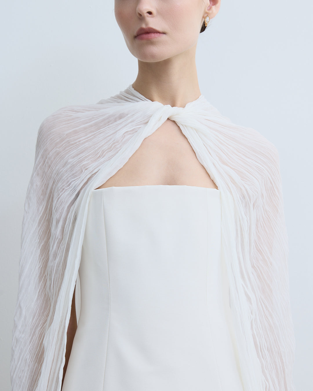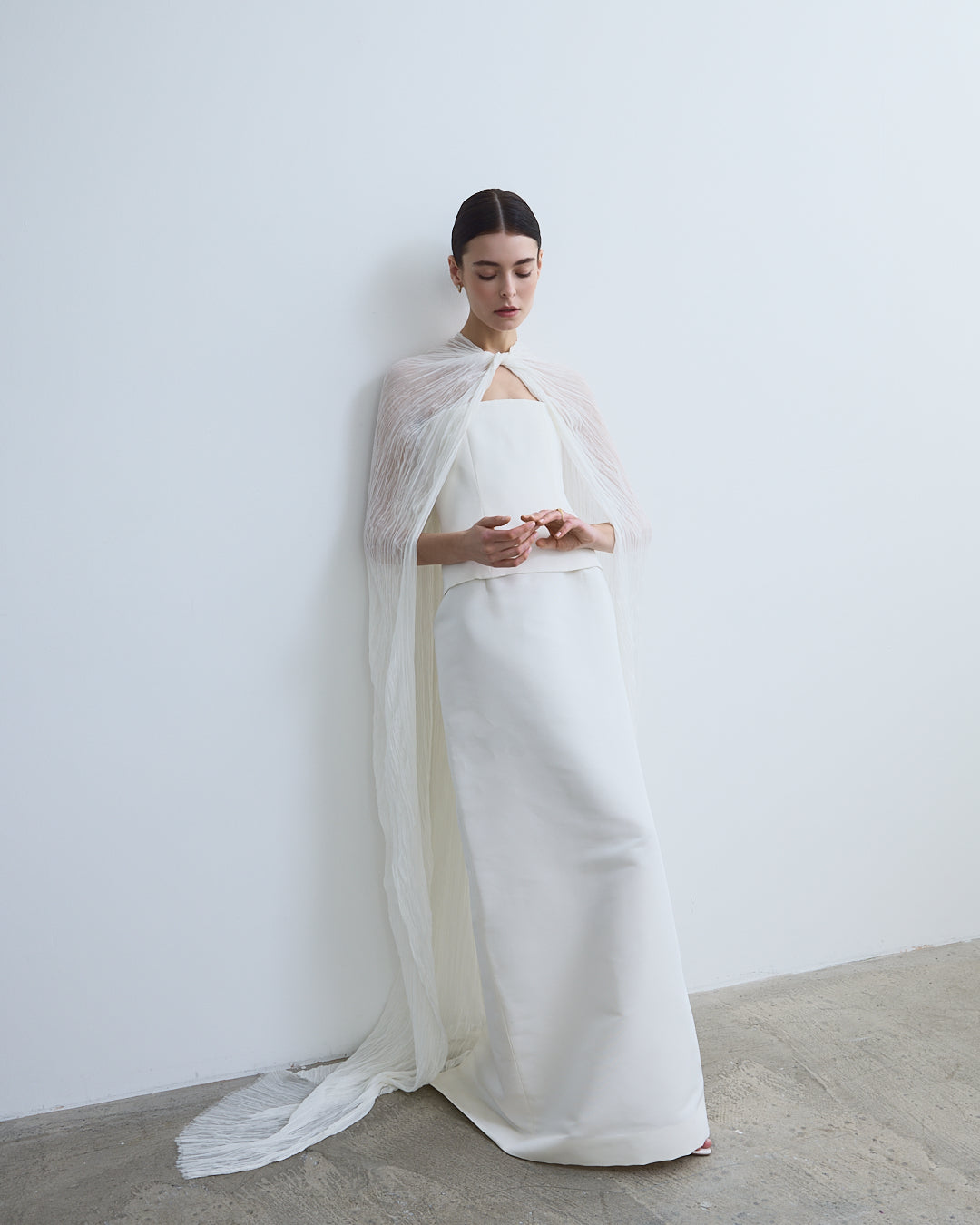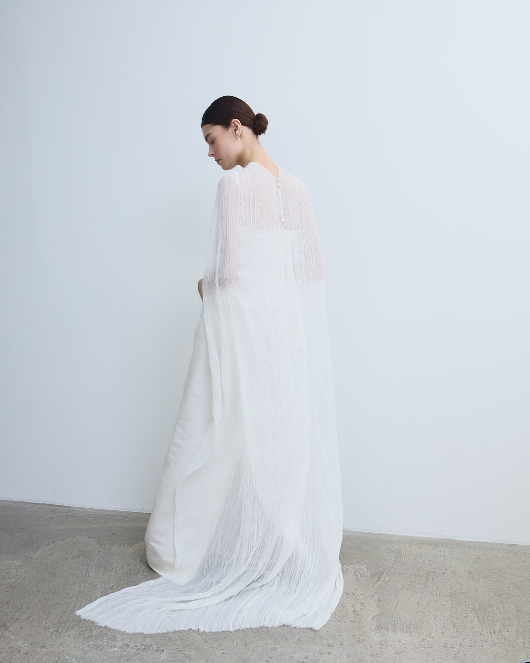 crushed silk chiffon cascades from our spencer cape, ideal for a current yet paired back wedding look. delicately fastened at the nape of the neck with silk covered buttons and pooling at the floor with an organic raw hem, spencer balances clean yet contemporary beauty.