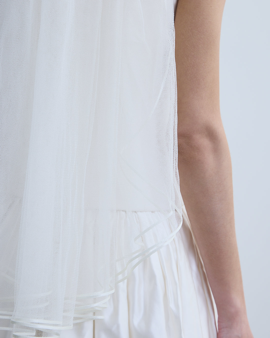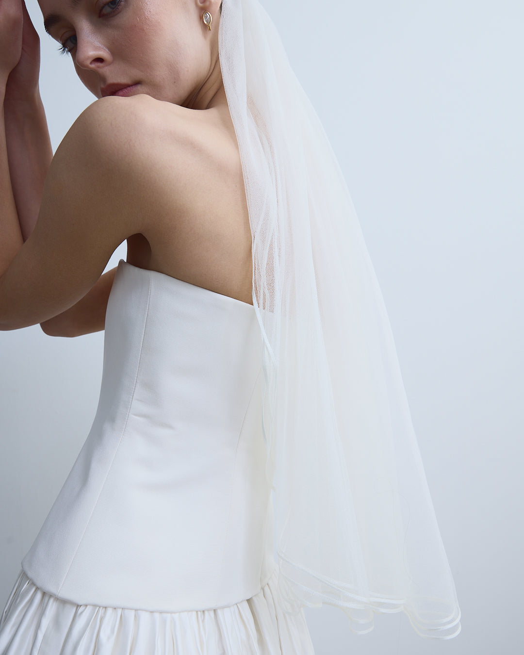 this simple three tiered veil is delicately detailed with ribbon edging for the perfect 90's finish. carefully woven into a metal comb, this veil is handmade in london in 100% ivory silk tulle.